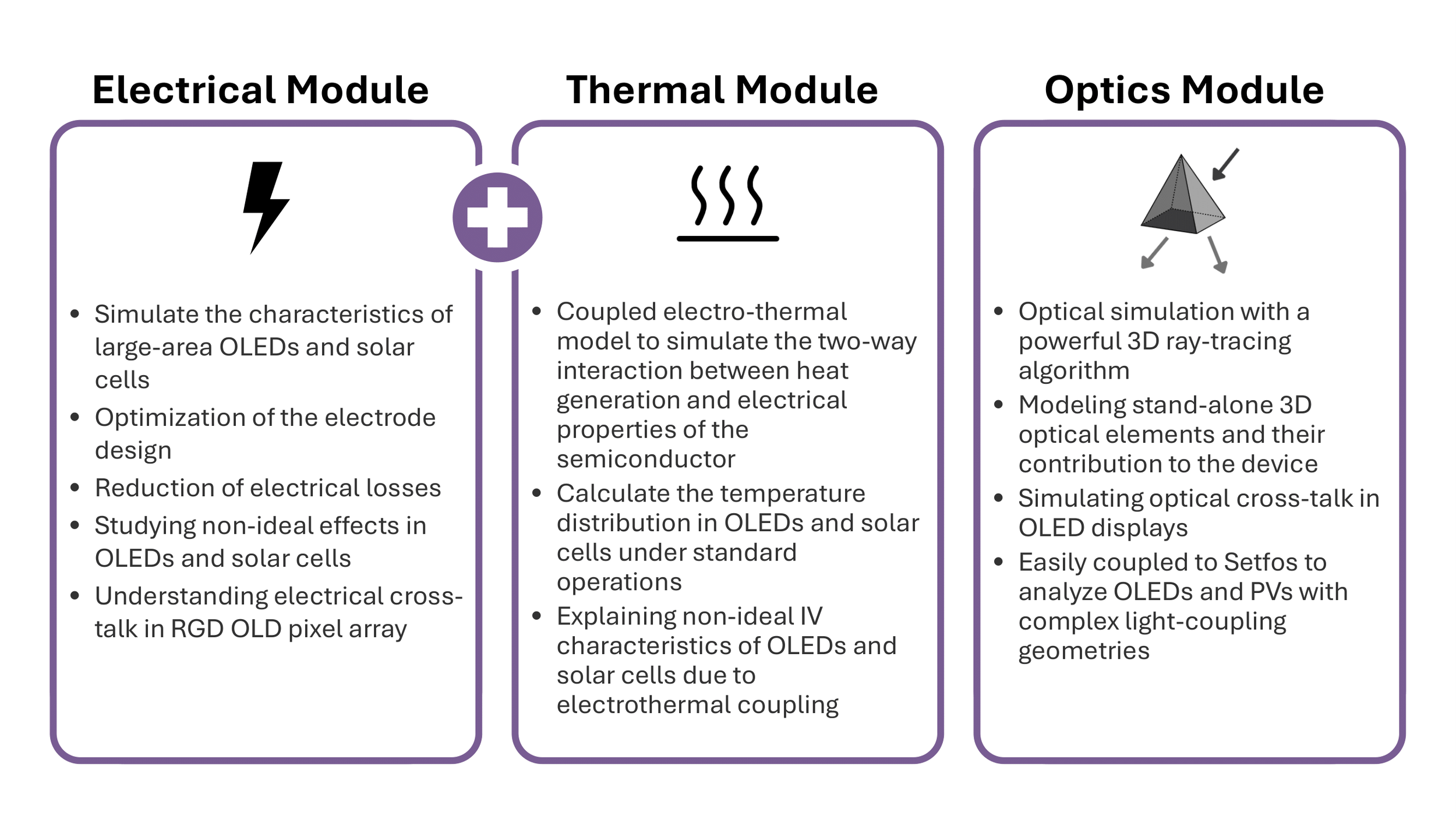We offer three modules with Laoss: Optical, Electrical, and Thermal. The optical and electrical modules can be purchased separately. The thermal module requires a license of the electrical module and considers electro-thermal coupling.