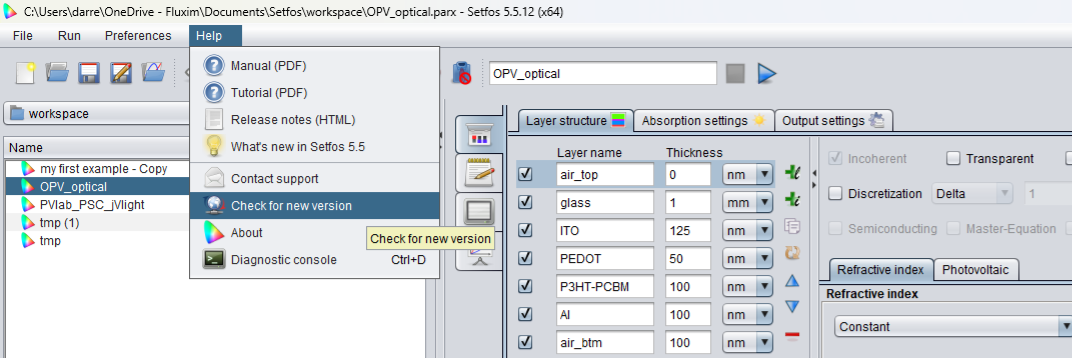 We recommend upgrading to the latest version so you can benefit from the latest features and enhanced simulation capabilities. To update to version 6.0, start Setfos and click on Help > Check for new version.
