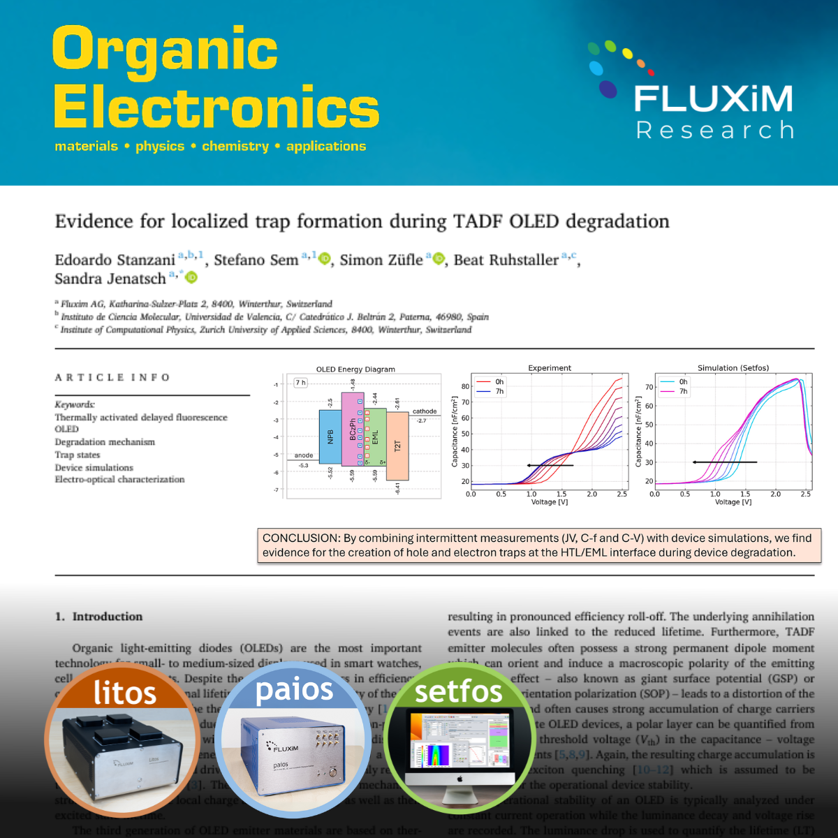 Setfos was used to fit the device's electrical characteristics and simulated the impact of the trap states on the device's behaviour. With Paios, we performed intermittent electro-optical tests during the device degradation studies, such as steady-state JV characterization and C-f analyses. Litos stressed our OLEDs under constant current and allowed us to record their emission during the degradation analyses.