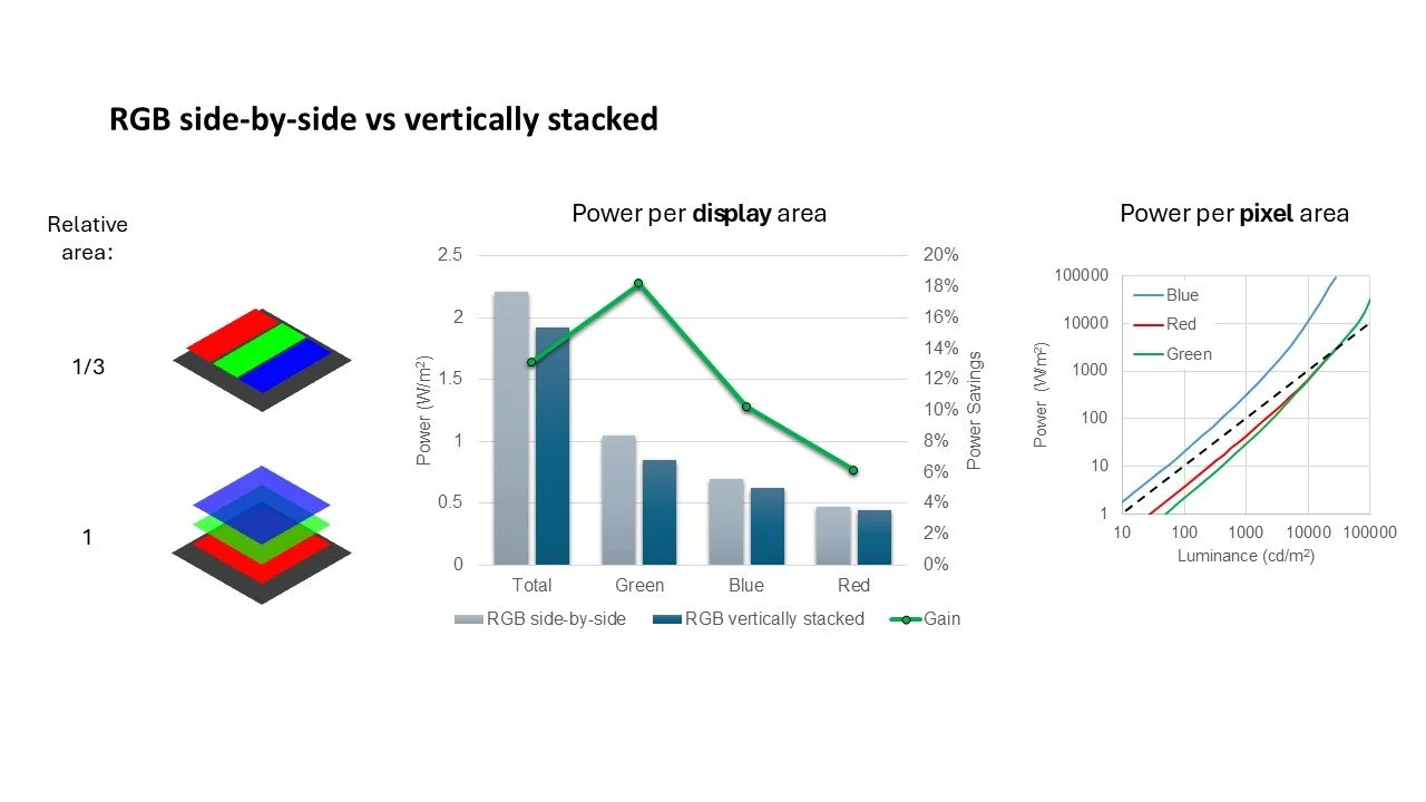 Comparisons between standard RGB and tandem RGB layouts show up to 36% power savings for the same displayed image. Such insights allow researchers to quantify the benefits of stacked pixels before fabrication.