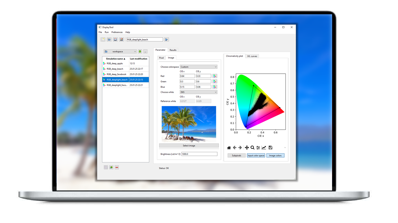 Displays are composed of at least three subpixels defining the reachable colour space. The coverage, size ratio, optical and electrical characteristics of these subpixels determine both power efficiency and visual performance. Opixs allows scientists and engineers to test and optimize new concepts virtually, and benchmark them against established technologies.