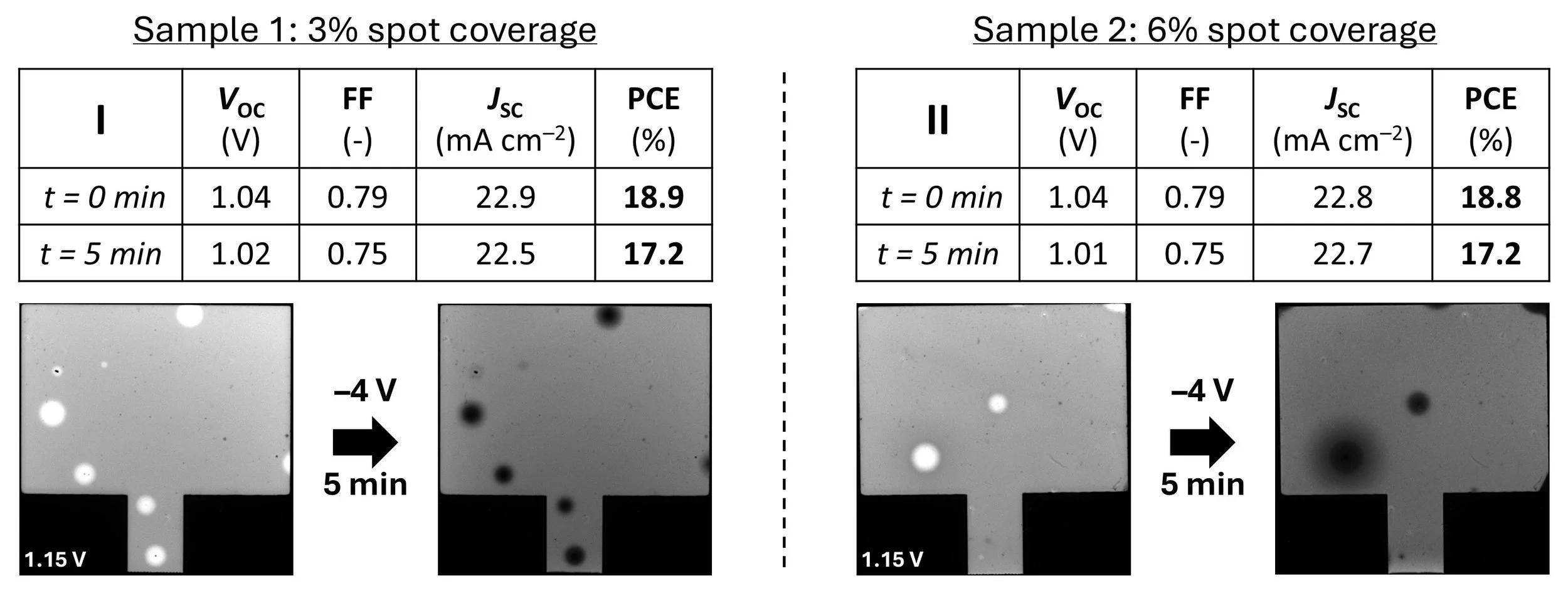 To understand the effect of dark spots on device degradation, two devices with different levels of spot coverage were tested and compared (see Figure 10). It can be seen here that the two devices exhibit almost equivalent performance, with PCEs of 18.9% and 18.8% respectively, despite the significant difference in the number of bright spots. Additionally, after reverse-bias stressing, the performance of both devices remains equivalent, but the dark spot coverage relative to the total device area varies substantially. This implies that there is no correlation between the area of the affected spots and device performance as measured in JV sweeps. We can conclude that the spots do not affect the unaffected regions, for example through shunting behaviour. However, we cannot rule out reduced efficiency within the area covered by the spots (e.g. a reduced short circuit current or Voc within the spot area, which would have a minor impact on overall performance).