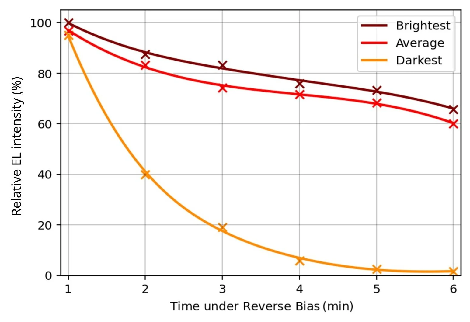 Table 1. Device performance before and after reverse-bias stressing procedure at various voltages. The initial performance of all devices is very similar. The PCE was measured using a white LED illumination equivalent to 1 sun.