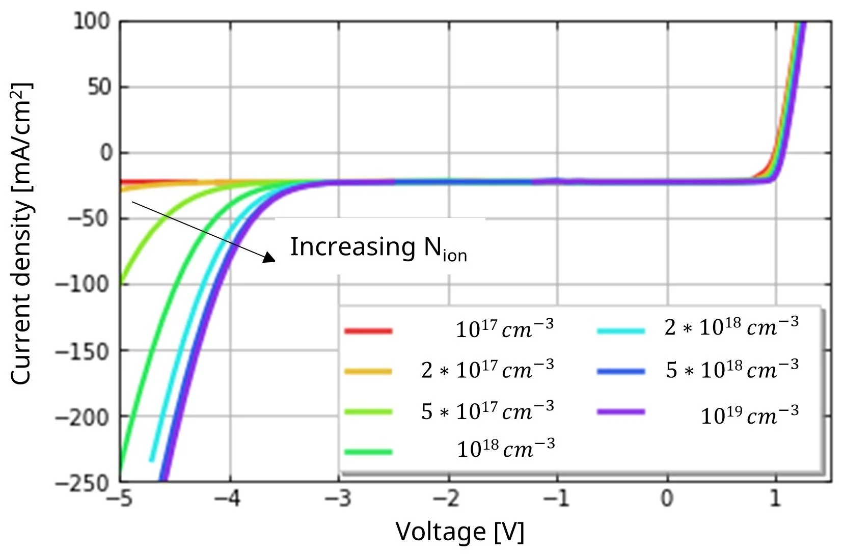 Reverse-bias breakdown in perovskite solar cells is frequently characterized by an abrupt increase in reverse current density. The reverse breakdown voltage (VBD) has been defined as the point where current density reaches -1 mA/cm² [11,12]. Typical VBD values range from -1 V to -5 V [13], though recent advances have achieved -8 V and lower [14]. This breakdown originates from band-to-band tunnelling at the electron transport layer (ETL) [13–15], also termed Zener breakdown [8,16]. Consequently, the experimental reverse-bias breakdown of p-i-n structured perovskite solar cells varies significantly depending on the HTL used. [14,17] The strong electric fields under reverse-bias are further modulated by ion-induced field screening, making the breakdown voltage depend on ion density—as explored in prior work [8]. Higher ion densities amplify electric fields near contacts and thus tunnelling currents, as depicted in Figure 3b. The tunneling model leading to reverse-bias breakdown is described in [6] while details about the solar cell stack and the employed material parameters for this simulation can be found in [18].
