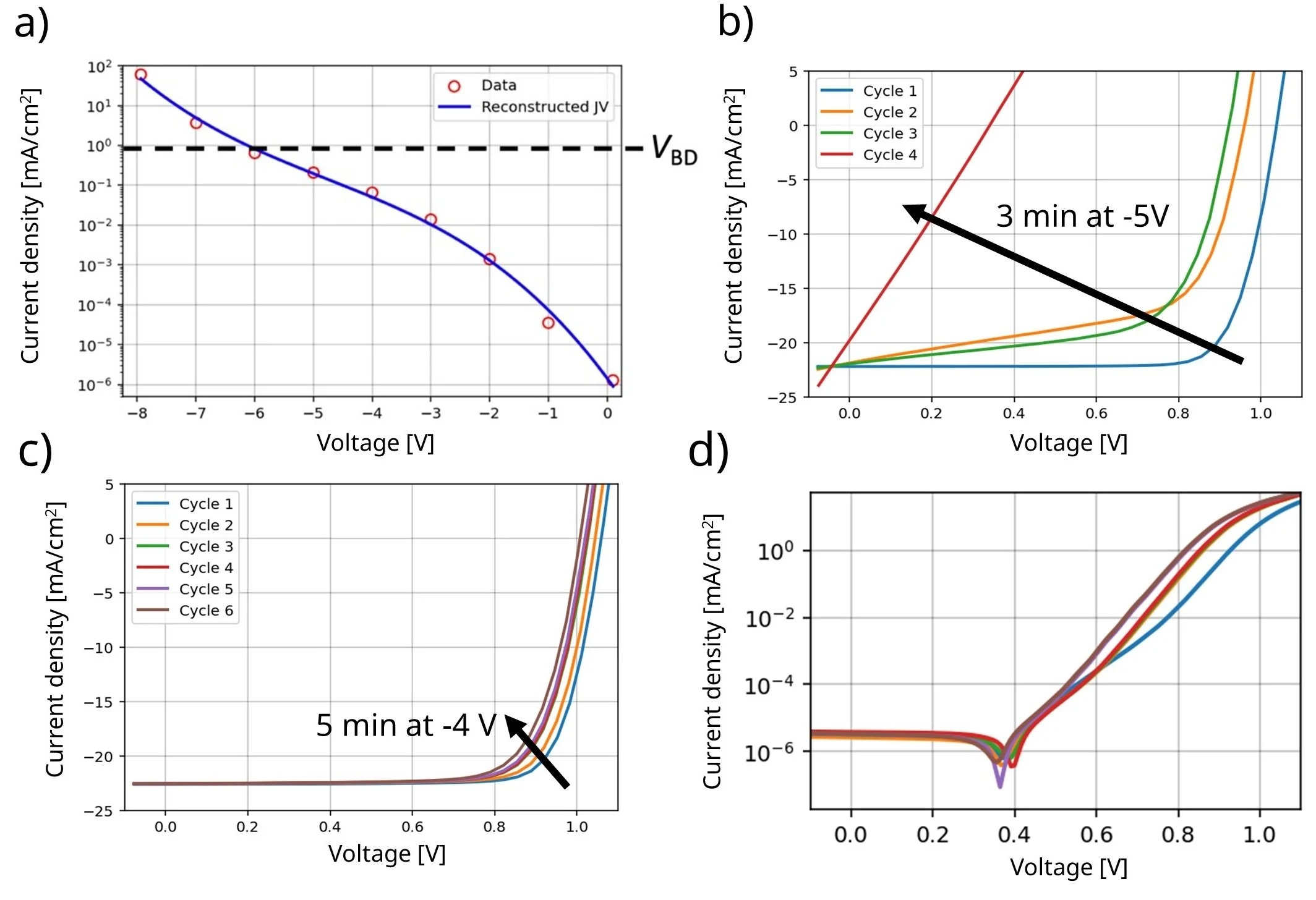 Figure 5. a) Reverse-bias current densities were measured at individual voltages, with the breakdown voltage (VBD) indicated. JV curves measured between reverse-bias stressing b) at -5 V and c) at -4 V. d) Dark JV curves measured between reverse-bias stressing at -4 V.