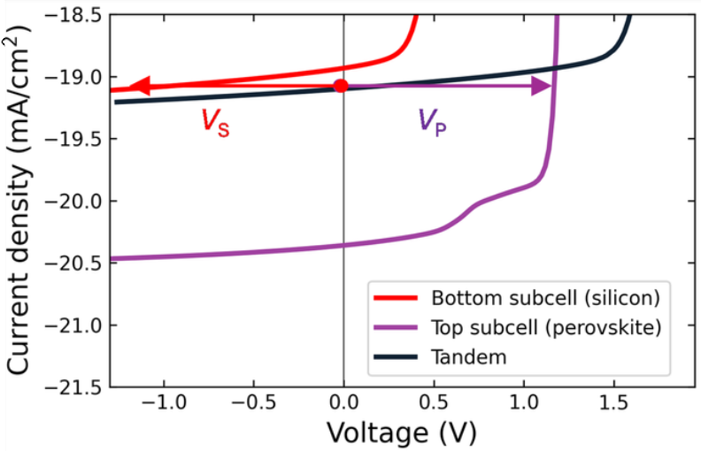 One potential solution to high reverse-bias is placing a bypass diode across each individual cell, though this remains costly at scale. However, emerging PV technologies face scenarios where even this approach fails to fully prevent reverse-biasing. For instance, monolithic interconnected cells exhibit the same behaviour when one sub-cell is shaded as investigated in our previous simulation study of perovskite-silicon tandem solar cells [8]. Additionally, tandem cells - effectively two sub-cells in series - suffer current mismatch between top and bottom junctions, driving one into reverse-bias during operation as illustrated in Figure 2 and detailed in previous analysis [9,10]. However, in this case, the maximum reverse-bias on the perovskite sub-cell is limited to approximately one open-circuit voltage in tandem.