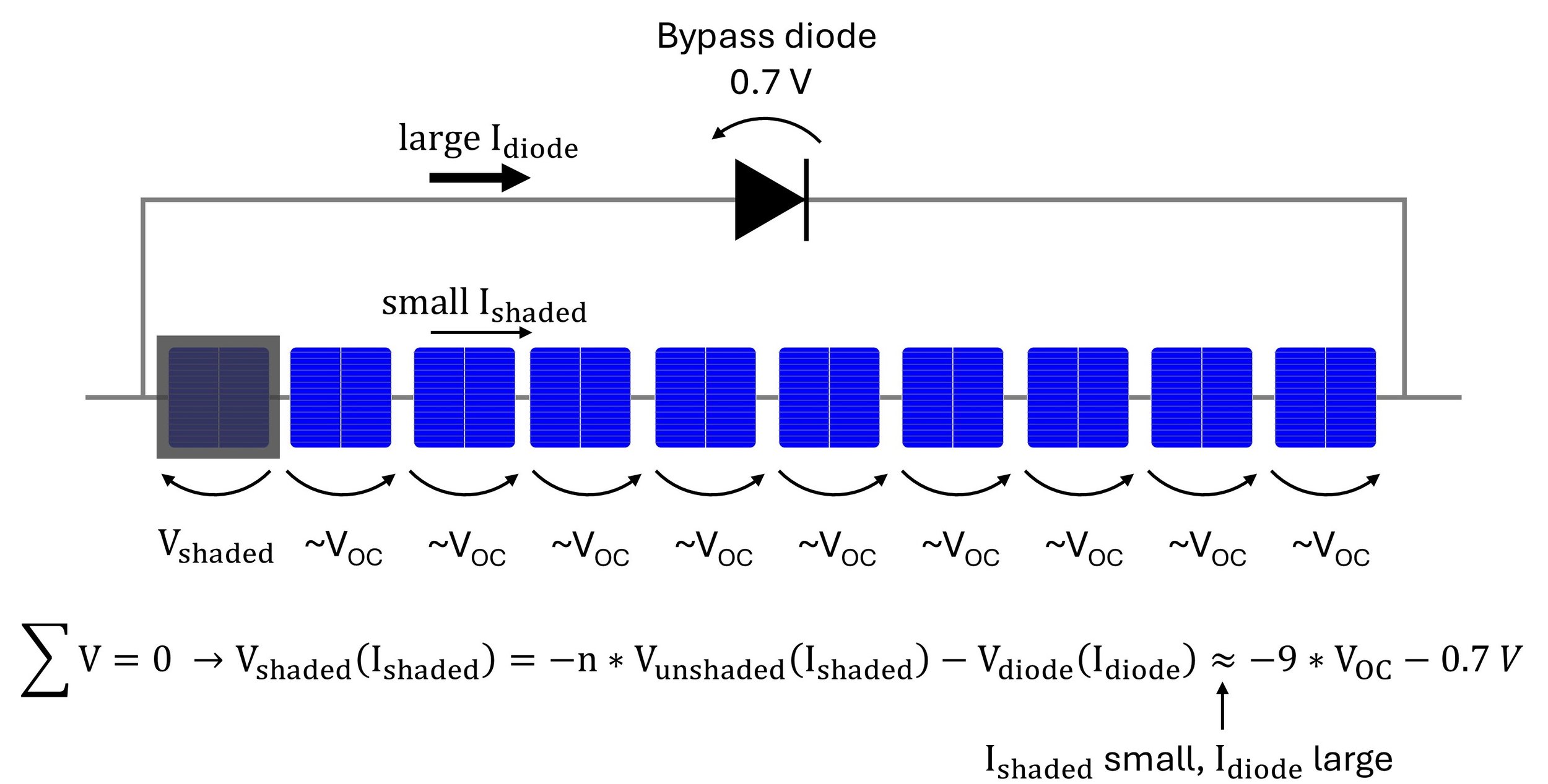 However, as shown in Figure 1, the shaded cell is still strongly reverse-biased. When most of the current flows through the bypass diode and very little through the string containing the shaded and unshaded cells, the unshaded cells are at or close to VOC. The VOC of all these cells must be compensated for by a similar reverse-bias in the shaded cell, since the sum must equal the small parallel bypass diode voltage. This follows from Kirchhoff's voltage law, which dictates that the sum of voltages in a parallel connection must equal zero, so the voltage drop across the bypass diode must equal the sum of the voltage drops across the unshaded and shaded cells.