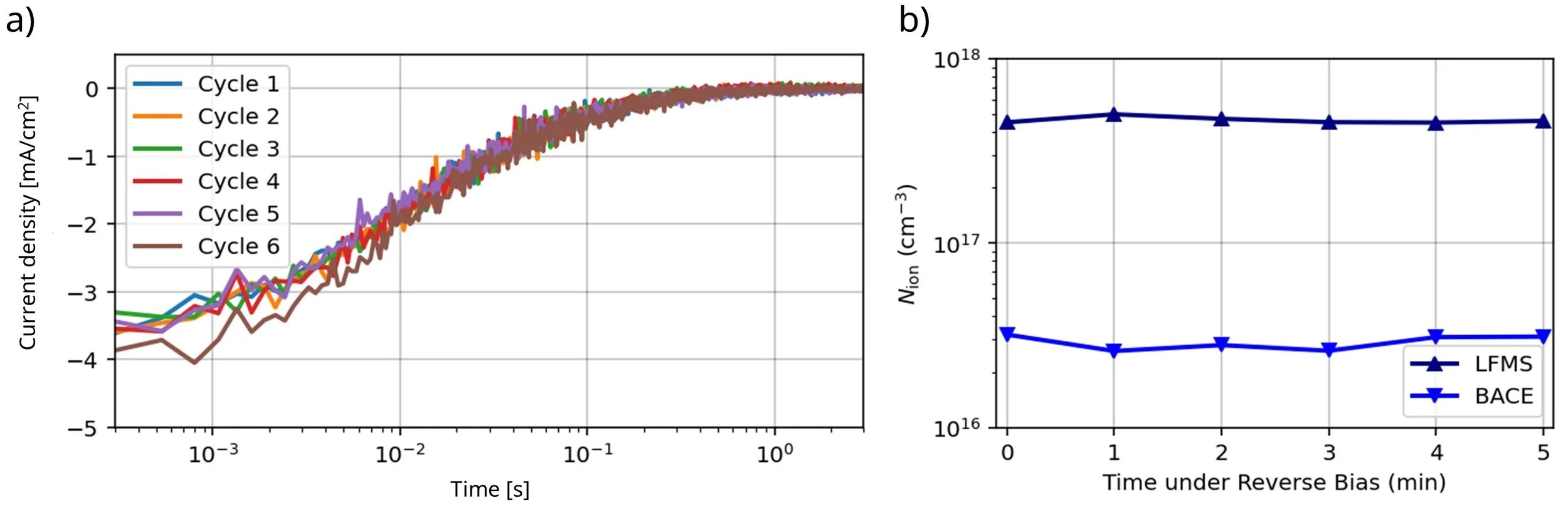 Figure 6. a) BACE current transients and b) calculated mobile ion densities from BACE and LFMS between reverse-bias stressing at -4 V for 1 min per cycle.