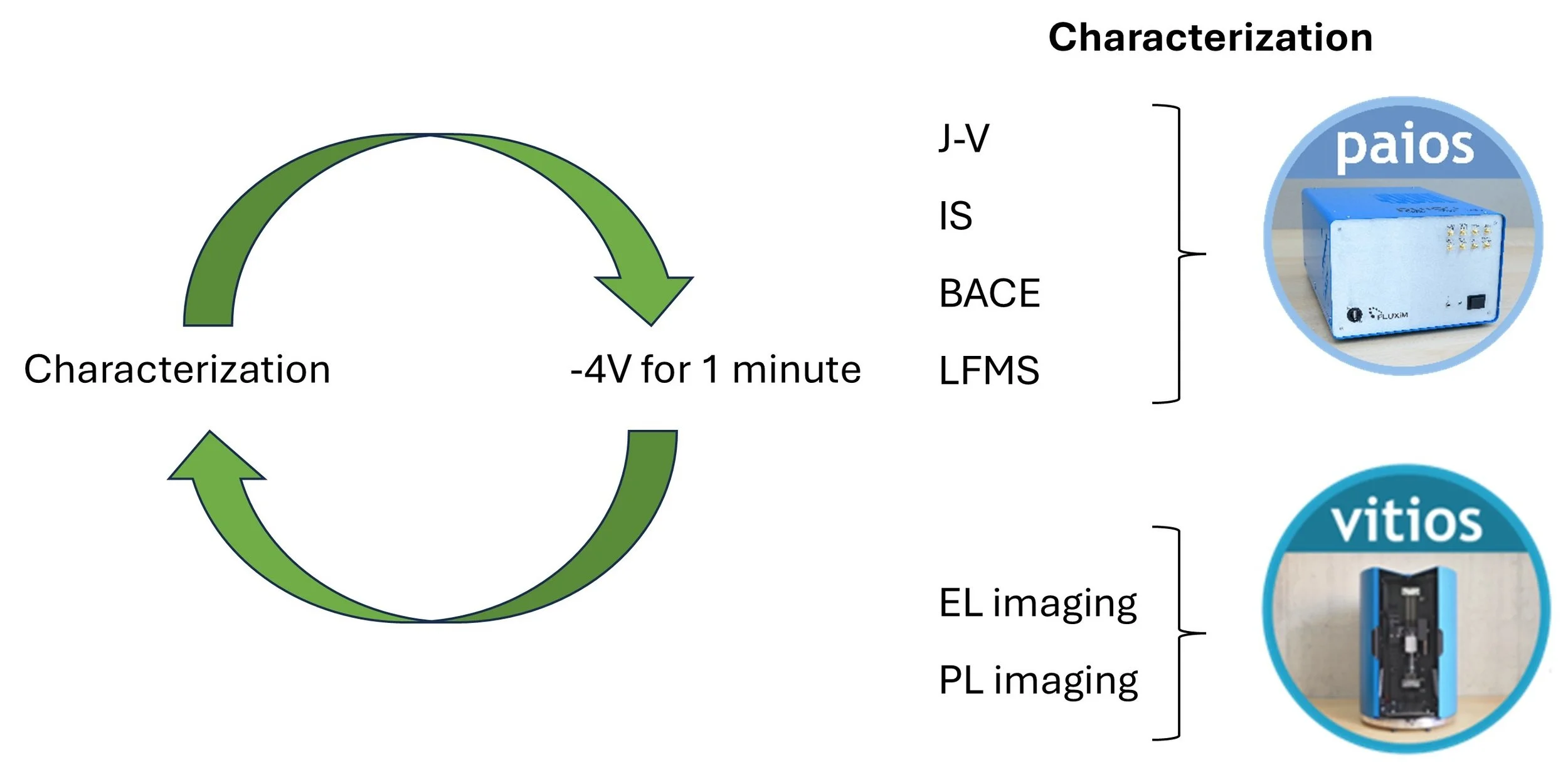 To characterise the effects of reverse-bias on PSCs, we employ a novel combination of experimental techniques. Previous research has primarily focused on current-voltage (I-V) analysis and, to a lesser extent, infrared thermography [11,22,23] or electroluminescence/photoluminescence (EL/PL) imaging [24]. In contrast, our study integrates impedance spectroscopy (IS) and transient electrical measurements with Paios to directly monitor ionic charge transport (see Figure 4). This is coupled with EL/PL mapping using our multi-spectral imaging tool, “Vitios”, which is able to spatially and temporally resolve degradation patterns across the device. Vitios is currently being developed as part of the DICE Eurostars/Horizon Europe project and will soon be available.