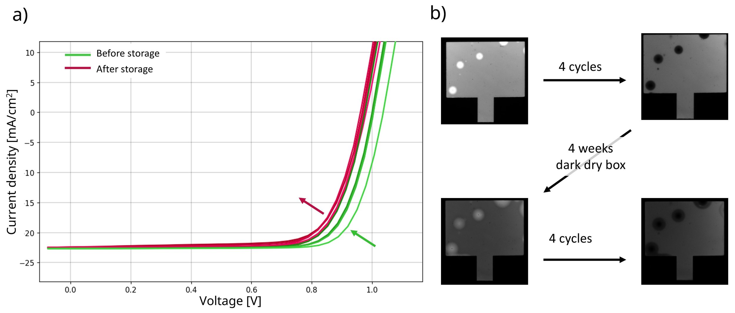 Figure 11. a) J-V curves under 1-sun equivalent illumination and b) EL maps at 1.15V (different pixel than in a). The samples were reverse-biases at -4 V for four 1-minute cycles (green curves). After the device was stored in dry air and light vacuum for 4 weeks and then the reverse-bias protocol was repeated (red curves).