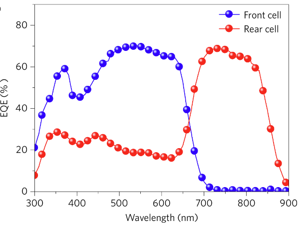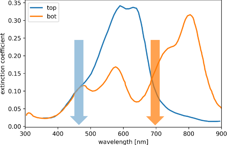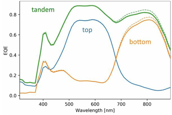 The model setup enables the simulation of the current flow through the entire solar cell, allowing us to closely replicate the experimental setting. This means that we can use monochromatic bias light with an intensity adjusted to approach AM1.5G illumination. A view to the wavelength dependent extinction coefficients (Figure 3) shows the best monochromatic illumination wavelength, to establish those conditions for the top and bottom cell i.e 470 nm and 700 nm. In other words, to measure the top-cell EQE, we bias the bottom cell with 700 nm and vice versa. Then, we obtain the EQE in differential form from the additional current induced by the weak monochromatic probe beam.
