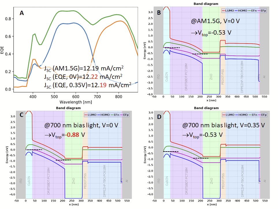 Figure 5: A shows the sub-cell EQE from coupled simulations under the application of bias light only (dashed lines) and with additional bias voltage (solid lines). B shows the band profile and quasi-Fermi level at short circuit conditions (V = 0V) and under illumination with the AM1.5G spectrum, for which a top-cell voltage of V=0.53 V develops. C shows the band profile and quasi-Fermi level under 700 nm bias light, the top-cell voltage at short circuit conditions amounts to V=0.88V. In D, the application of a bias voltage of V=0.35 V reproduces the AM1.5G short circuit conditions under bias light.