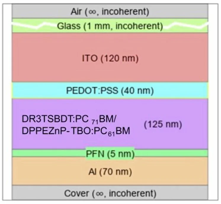 The modeled organic tandem solar cell consists of a top cell with DR3TSBDT:PC71BM as absorbing layer and a bottom cell with DPPEZnP-TBO:PC61BM as absorber, as described by Li et al. [1] The two sub-cells are connected by a recombination interlayer composed of ZnO and PEDOT:PSS. CuSCN and PFN are used as thin electron and hole blocking layers at the anode and cathode site. ITO and Al form the electrodes. The layer stack is shown in Figure 1..