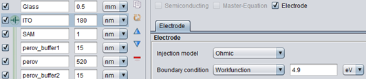 Setfos allows the user to define each of the solar cell’s layers as electrodes or as semiconductors. For electrodes with ohmic injection properties, the work function or the electronic injection barrier of the material is required as the only input parameter.