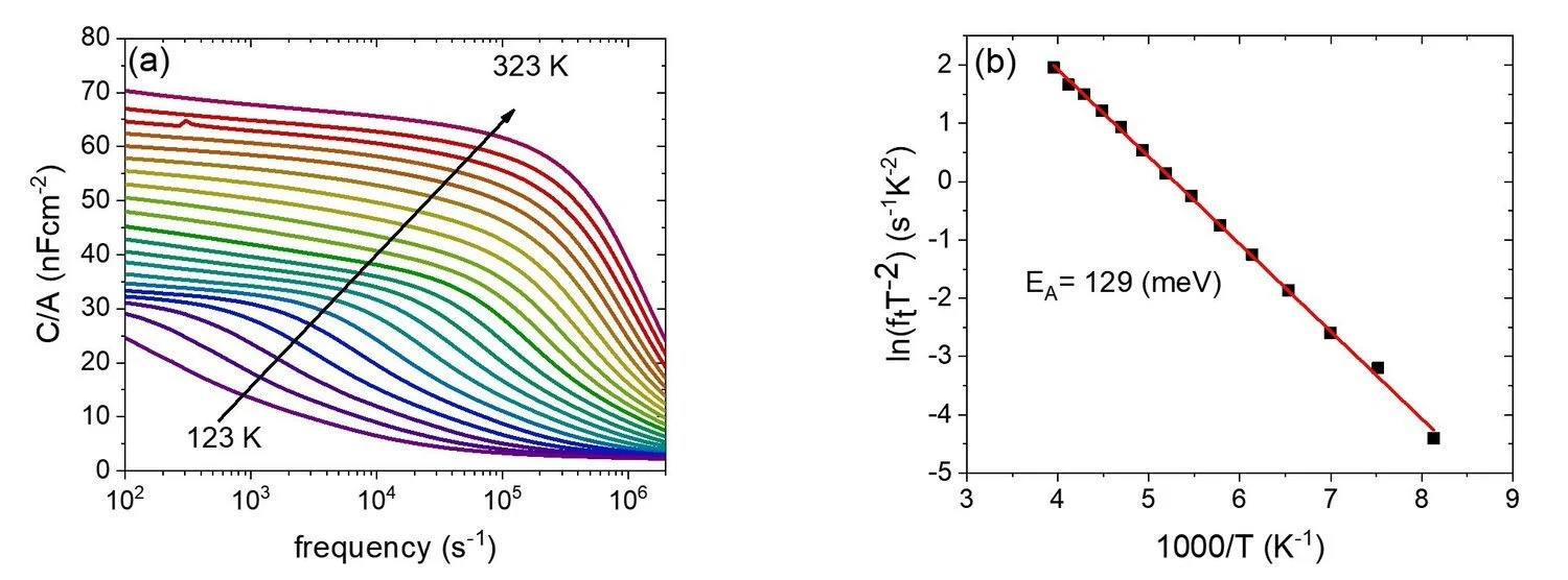 Figure 3 – a) representative temperature-dependent capacitance-density frequency measurements in the temperature range from 123 to 323 K with 10 K steps and frequencies from 100 Hz to 1 MHz of a device from sample A (Sn content of 27.6 at.%). b) Arrhenius plot of the inflection frequencies of a device from sample A.