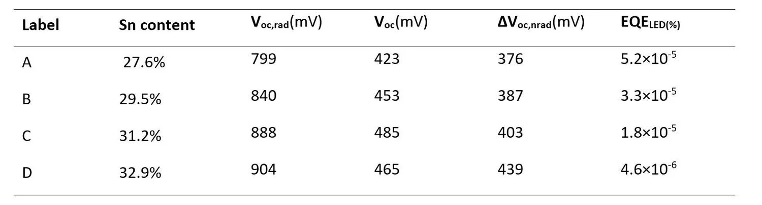 To increase the Voc and thus potentially the power conversion efficiency, it is necessary to minimize ΔVoc,nrad. It is, therefore, necessary to quantify the total loss and determine its origin.