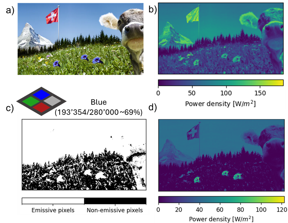 With the above defined content, Opixs will calculate the most efficient combination (lowest power consumption) of the 4 subpixels for each pixel of the loaded image to be displayed. The main result of Opixs is the power density (per subpixel) required to display a certain content. Beyond scalar key figures, also power density maps as shown in Figure 5 (b and d) are presented which allows one to analyse the spatial distribution of power density and compare it with the content to be displayed (a). In Figure 5c one can also inspect whether a specific (here blue) subpixel is turned on or off. In the example here, we see that the blue subpixel is not emissive in regions of grass and trees (green). This is because in these regions, the triangle spanned by RGW is more efficient (see also Figure 6, top right). The power density map for the blue subpixel (Figure 5d) further reveals that the power for the blue is highest for the blue flowers as their colour is close to the edge of the colour gamut.