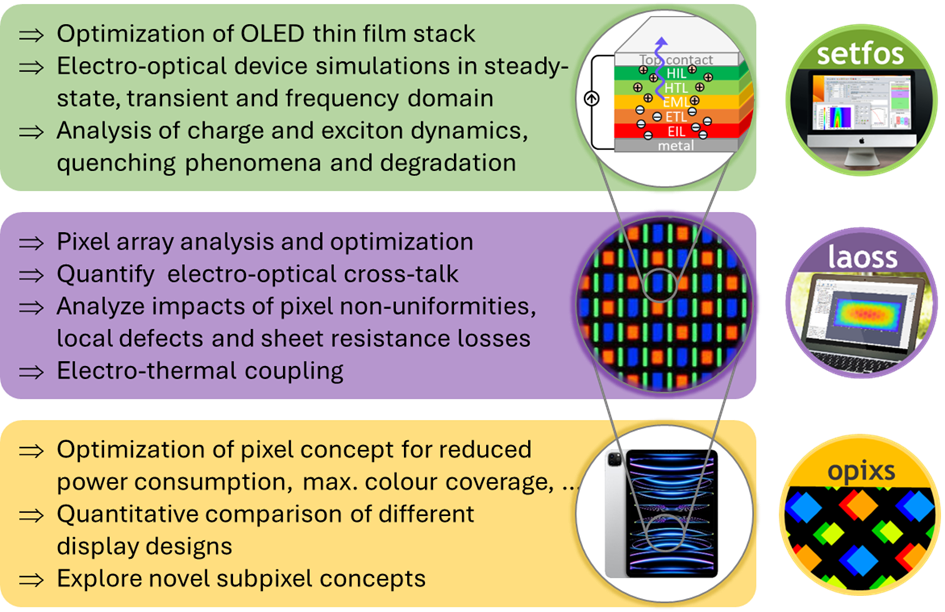 Fluxim has been supporting scientists and engineers working on display technologies along the full value chain with dedicated simulation tools. Setfos for electro-optical device simulations on a microscopic level and Laoss for electro-thermal and optical analysis of pixel arrays. To address the length-scale of the full emissive frontplane, we have developed a new simulation tool “Opixs” within the Innosuisse – Innovate UK project “DISCO”. The name is derived from Optimizing PIXel Structures to indicate the overall purpose of the simulation software. Opixs is used to quantify the power consumption of pixel structure to display specific content, analyse the colour gamut coverage and subpixel usage, as well as to virtually explore novel pixel concepts. In this blog post, we want to demonstrate typical application examples and substantiate the claims mentioned in the illustration below.