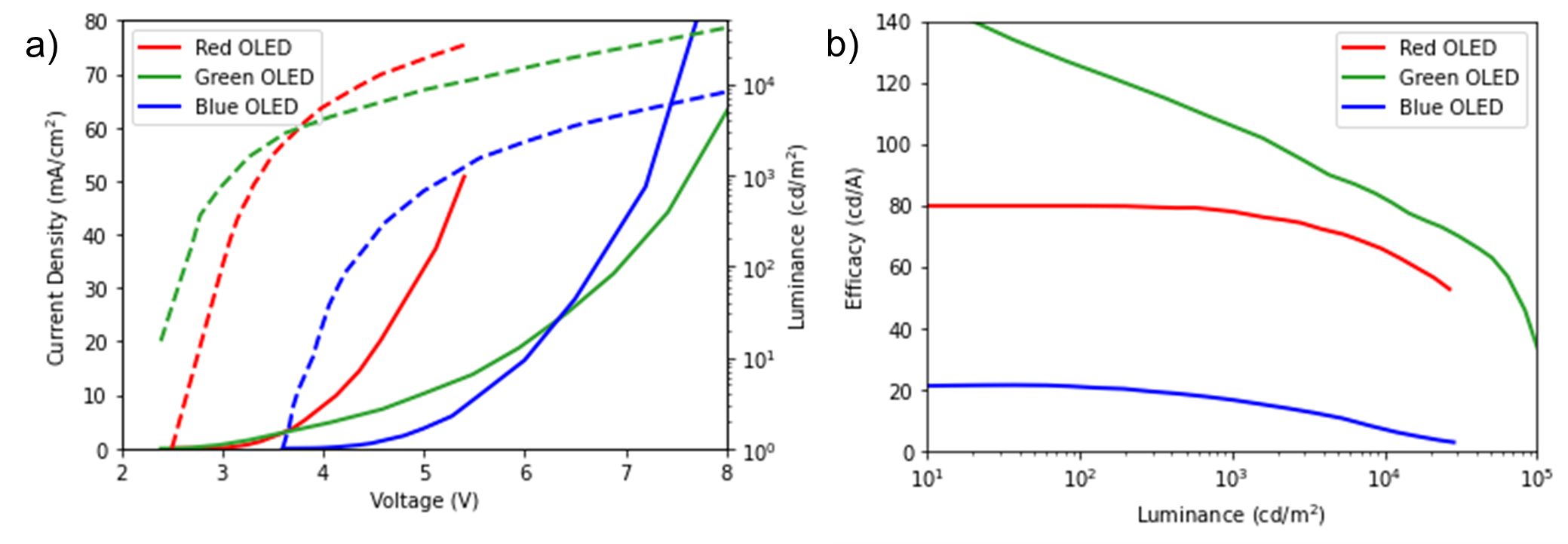 Figure 7. a) JVL curves from literature used for red [2], green [3] and blue [4] subpixels. b) current efficacy roll-off of the respective OLEDs.