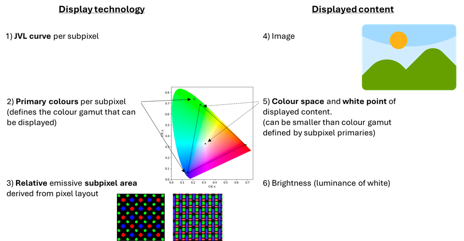 To visualise multi-coloured content, display devices require at least 3 primary colours. The area these primary colours span on the CIE colour diagram define the colour gamut of a display. In Figure 1 different commercially employed display technologies with their respective advantages and challenges are presented. Most of them use only 3 subpixels with red (R), green (G) and blue (B) primary colours. Only in RGBW displays, typically employed in LG OLED TVs, an additional white OLED subpixel is employed to enhance the brightness. However, also in this case only 3 out of the 4 subpixels are on simultaneously.