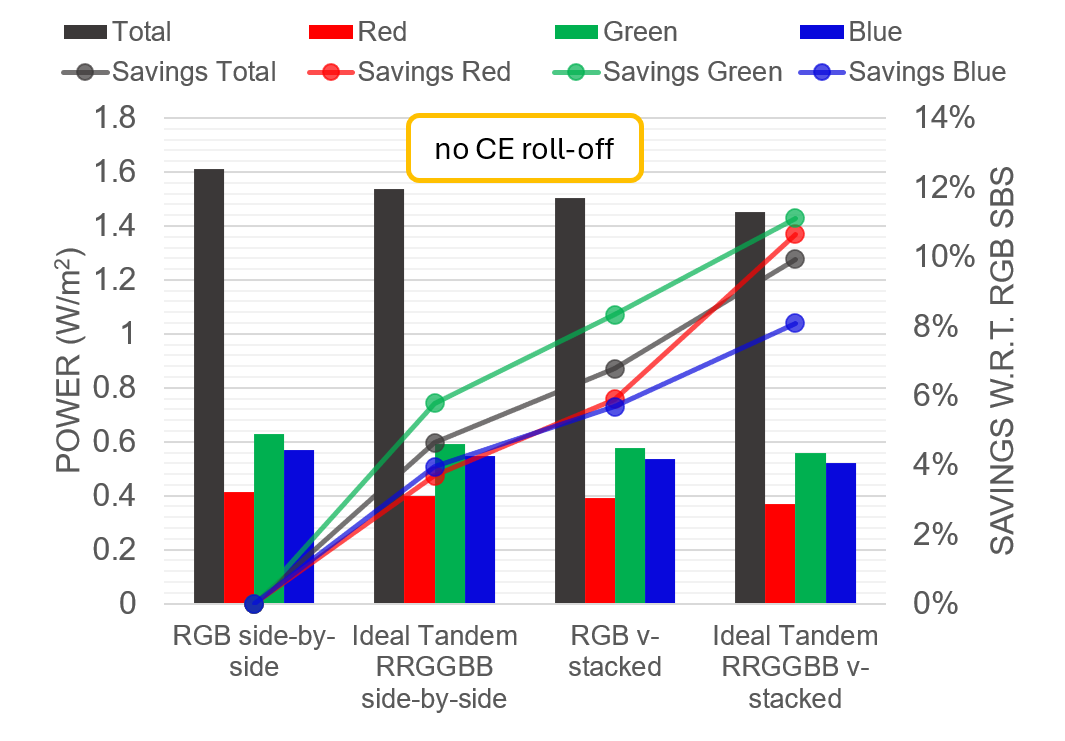 Power consumption for several display concepts without CE roll-off and the corresponding power savings relative to RGB side-by-side technology.