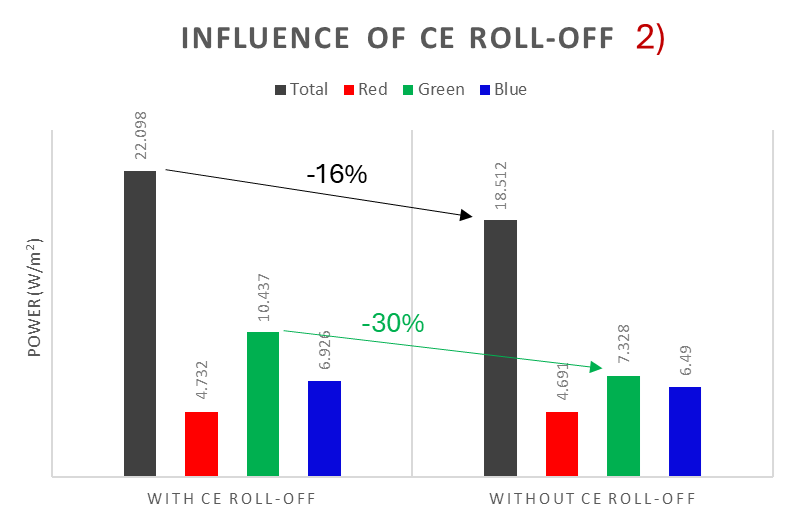 Quantifying the impact of the roll-off on the display power consumption is straightforward to simulate in Opixs. We therefore modified the luminance-voltage behaviour of all 3 subpixels in Figure 7 to exhibit a constant CE value. Figure 11 shows the total and subpixel power consumption for the RGB display at 1000 cd m-2. The total power consumption could be reduced by 16% if all the subpixels would not exhibit a CE roll-off. The green subpixel, showing the strongest loss compared to the peak efficacy (see Figure 7 and Table 1), would benefit the most.