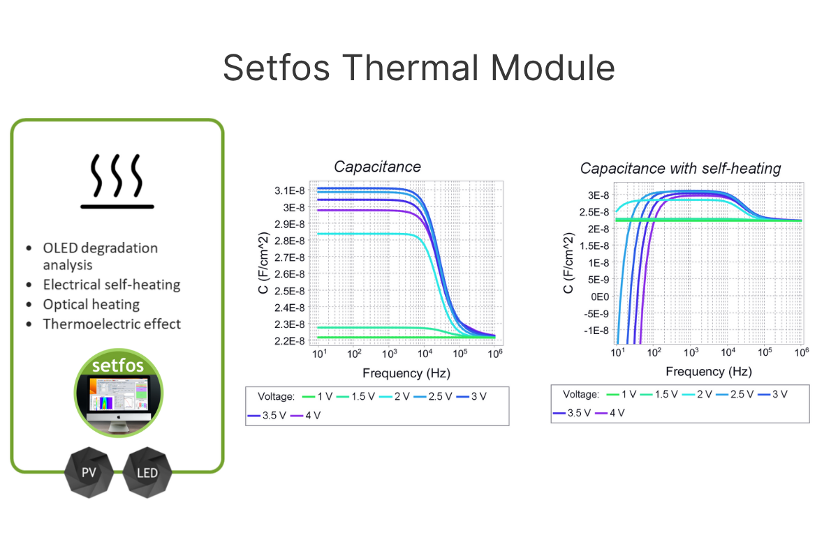 The Setfos Thermal Module quantifies temperature rise, heat flux, and heating contributions in layered semiconductor devices such as OLEDS and solar cells.
